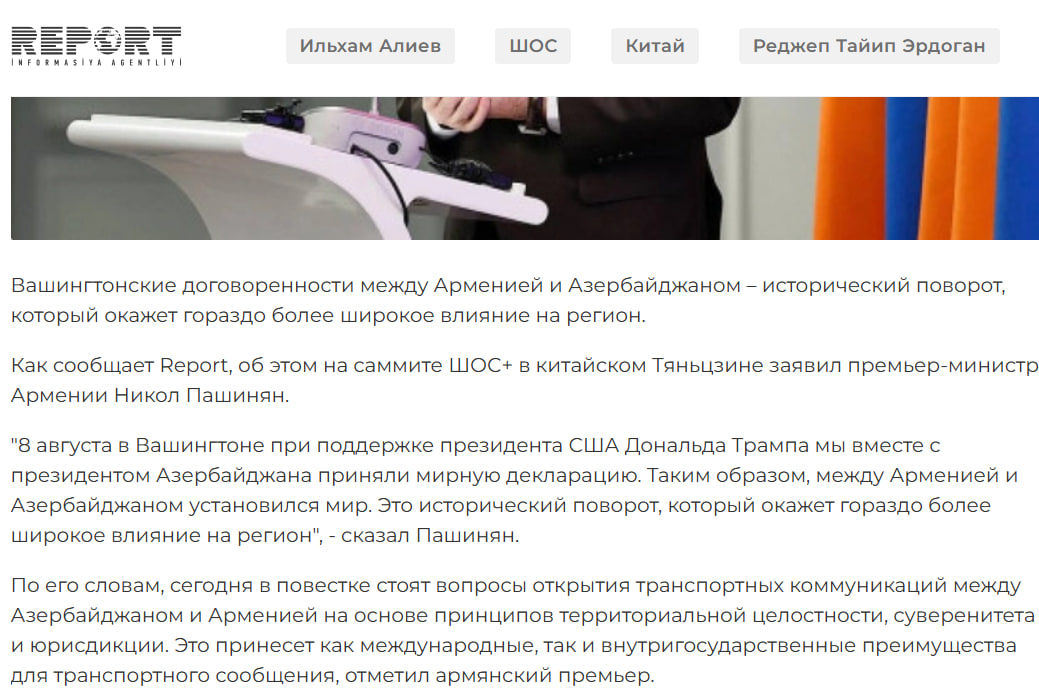 На саммите ШОС+ Алиев заявил, что «Зангезурский коридор в ближайшее время станет ещё одним важным сегментом Среднего коридора». Эти слова широко цитировались азербайджанскими изданиями. Однако выступление премьер-министра Армении Никола Пашиняна на том же мероприятии оказалось либо вырванным из контекста, либо вовсе проигнорированным.