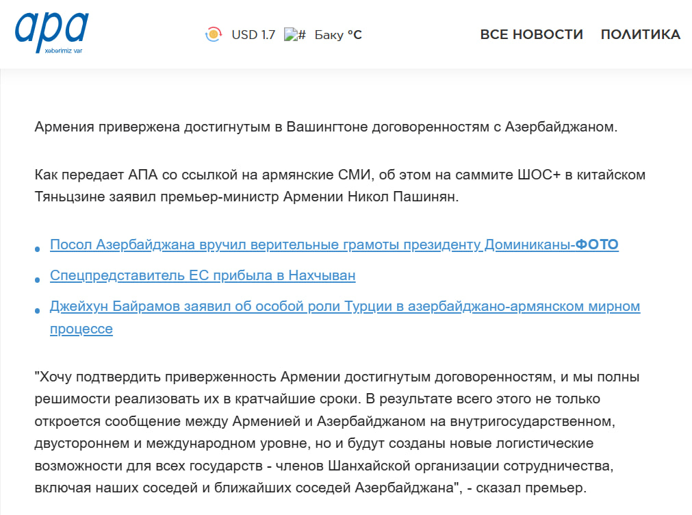 Таким образом, заявления двух лидеров, прозвучавшие на одной и той же площадке, преподносятся азербайджанской прессой однобоко и выборочно, без отражения позиции Еревана.