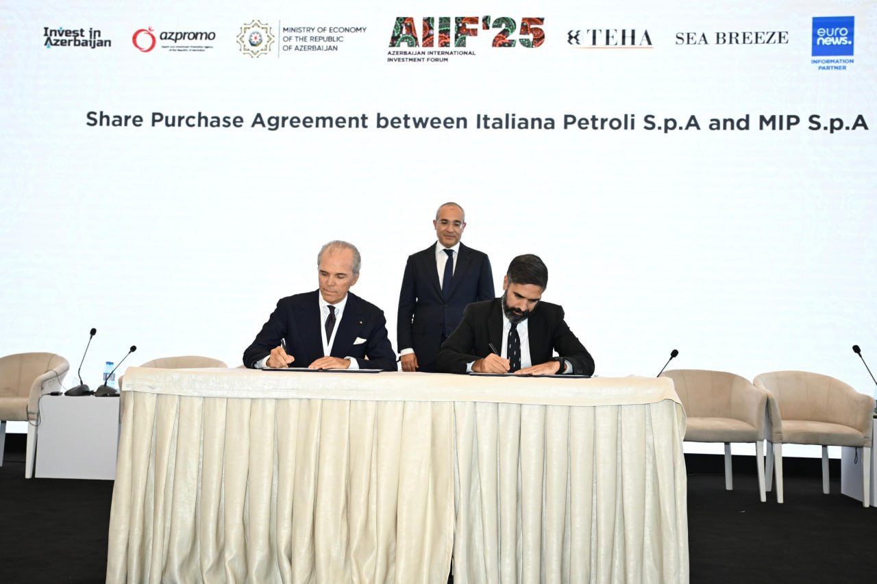 Министр экономики Азербайджана Микаил Джаббаров принял участие в церемонии подписания соглашения о покупке акций между SOCAR и итальянскими компаниями Italiana Petroli S.p.A. и MIP S.p.A., сообщает сам министр в своей публикации в социальной сети X.