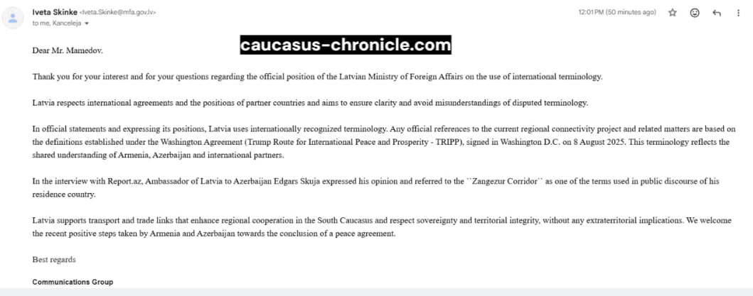 В связи с этим редакция «Хроники Кавказа» направила в Министерство иностранных дел Латвии официальный запрос с просьбой разъяснить позицию страны по использованию термина «Зангезурский коридор», учитывая, что власти Армении не признают его, и что данный термин официально не используется в Вашингтонских соглашениях. В запросе также уточнялось, планирует ли Латвия при продвижении региональных транспортных инициатив опираться на международные проекты, такие как TRIPP, и координировать свою позицию с партнёрами, чтобы избегать двусмысленности.
