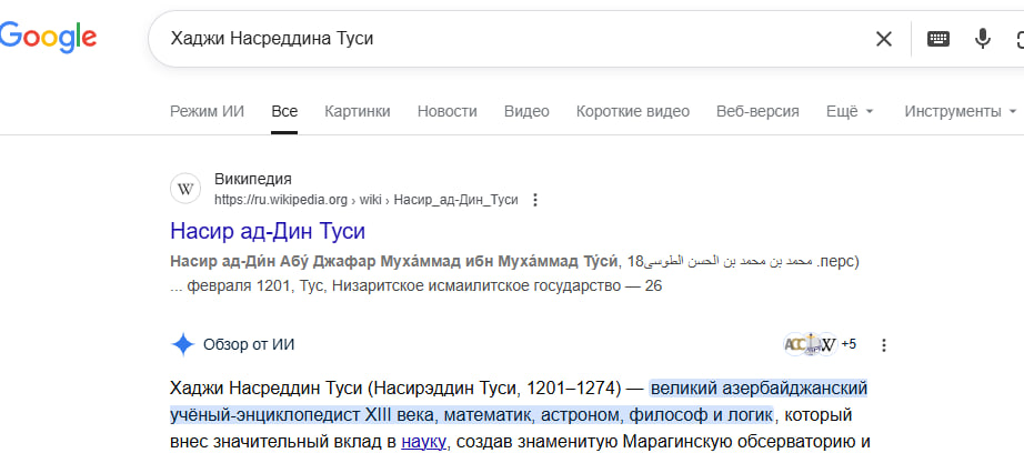 Покажем это на конкретном примере. Пока мы готовили материал, ИИ поисковика Google выдал неожиданный результат: Хаджи Насир ад-Дин Туси, о котором упоминал Мовахедиан, в выдаче оказался подписан как «великий азербайджанский учёный-энциклопедист XIII века».