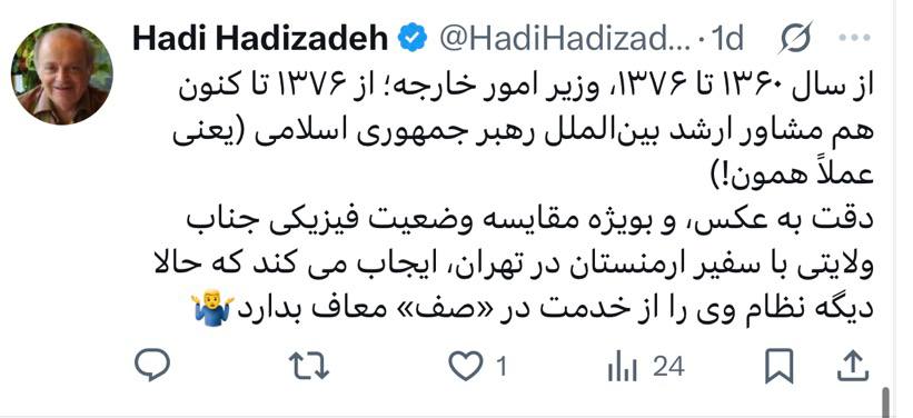 Другие комментарии фокусируются на личном статусе советника и его способности выполнять свои обязанности. Например, один пользователь отметил: «С 1981 по 1997 год он был министром иностранных дел, с 1997 года по настоящее время — старшим международным советником лидера Исламской Республики Иран (то есть он, по сути, тот же человек!). Сравнение физического состояния господина Велаяти с физическим состоянием посла Армении в Тегеране также привлекло внимание: «Глядя на фотографию, и особенно сравнивая физическое состояние господина Велаяти с физическим состоянием посла Армении, можно предположить, что, возможно, пришло время освободить его от обязанности на «передовой».