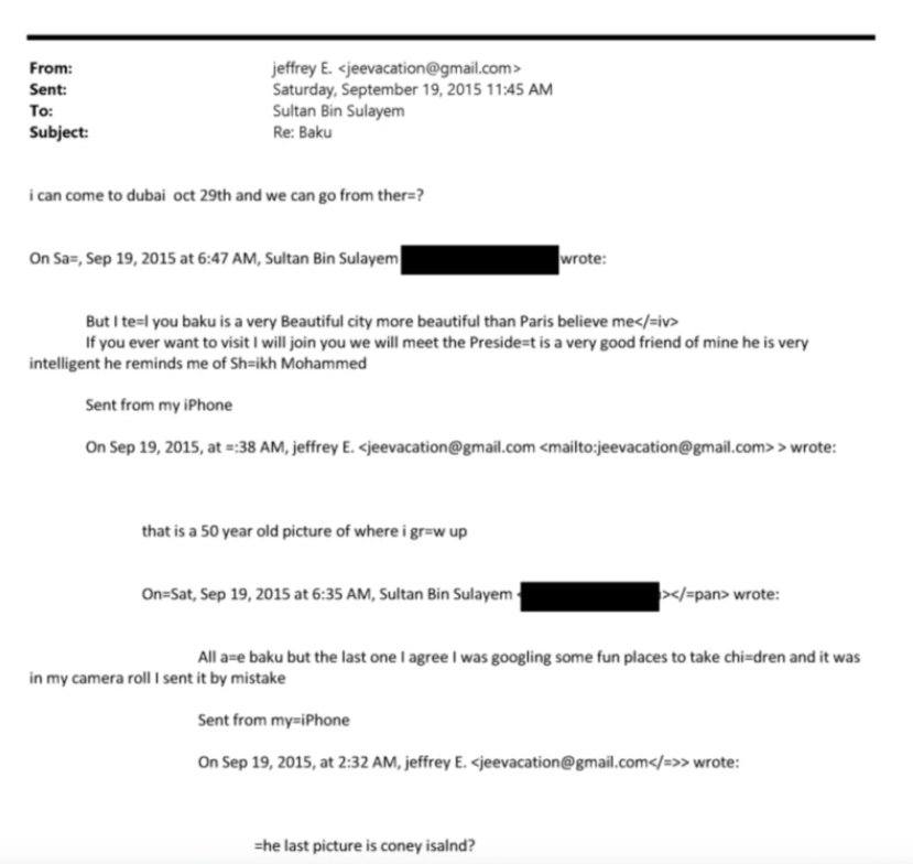 Значительная часть «азербайджанского досье» связана с перепиской Эпштейна с человеком, идентифицированным как «Sultan Bin Sulayem». В письмах от 2011 и 2015 годов отправитель активно рекламирует Баку, называя его «очень красивым городом, который даже прекраснее Парижа».