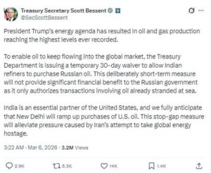 Глава Минфина Скотт Бессент пояснил, что данная лицензия действует до 4 апреля и распространяется на нефть и нефтепродукты, отгруженные на танкеры не позднее полудня 5 марта по восточному времени США.
