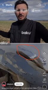 По его словам, эта надпись заметна на видео, опубликованном провластным азербайджанским телеканалом Baku TV, где показаны остатки сбитого беспилотника.