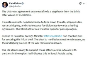 Верховный представитель ЕС по иностранным делам Кая Каллас назвала соглашение о прекращении огня между США и Ираном важным шансом для деэскалации.